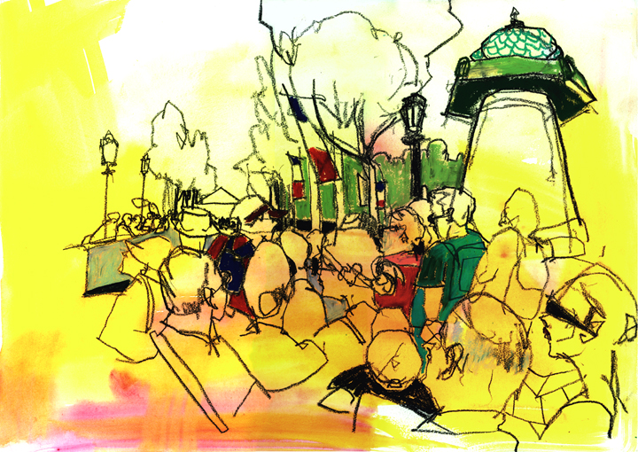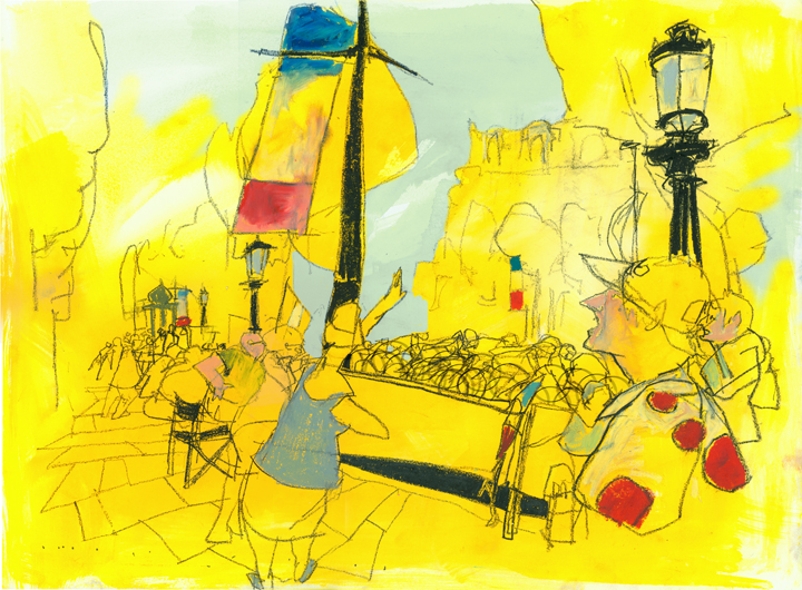 On the eve of the 2007 Tour de France’s conclusion in Paris, I thought it would be a perfect time to share some drawings I made at last year’s Tour finale. I set out to cover the event, one that I had only read about and seen briefly on the television in Paris. All I can say is that that in no way prepared me for the spectacle that it was. The crowd was large, and very friendly.